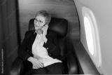 beautiful aged woman in the cabin of a private plane in an armchair with a phone in her hands