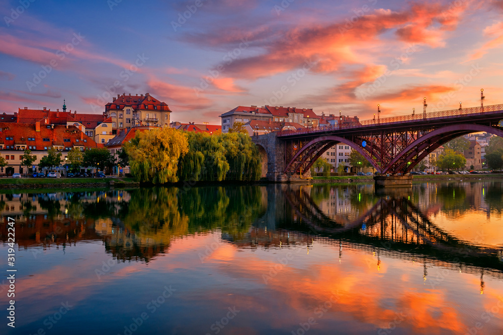 Amazing view of Maribor Old city, Main bridge (Stari most) on the Drava river before sunrise, Slovenia. Scenic cityscape with color sky and reflection, travel background for wallpaper or guide book