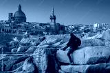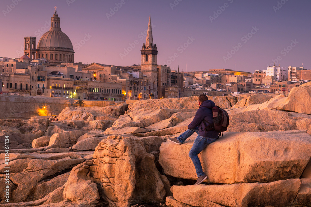 Man sitting on the rock and watch beautiful architecture of the Valletta city at dawn, Malta