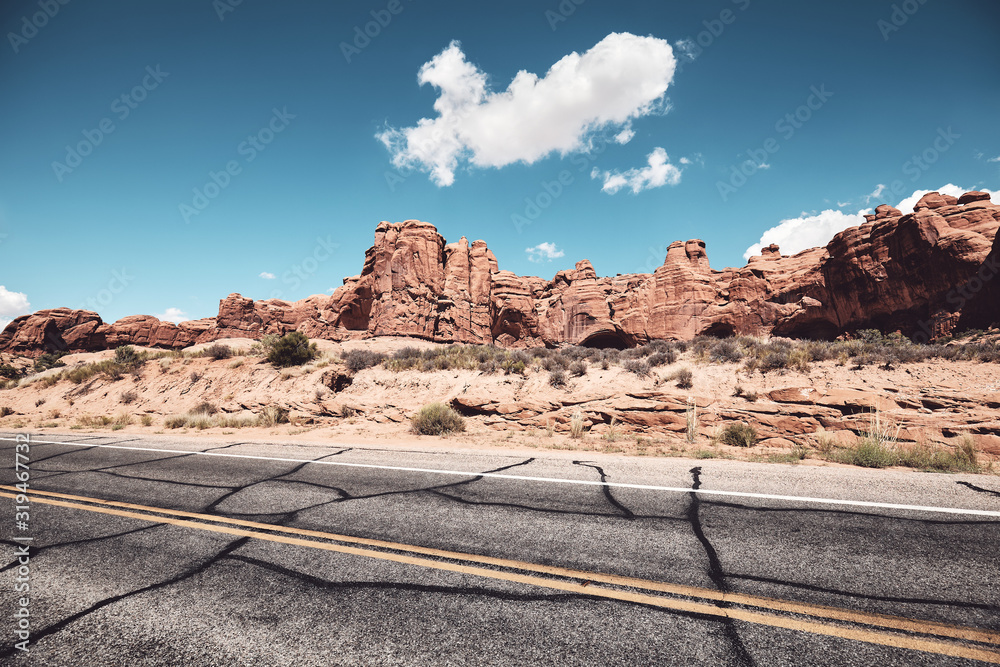 Retro colors toned picture of a scenic road in Arches National Park, Utah, USA.