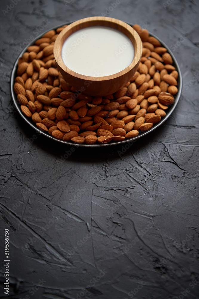 Composition of almonds seeds and milk, placed on black stone background.