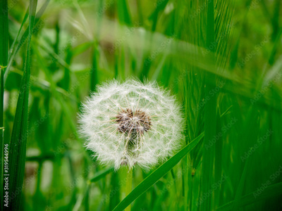Dandelions in green weadow across the forest. Early summer.