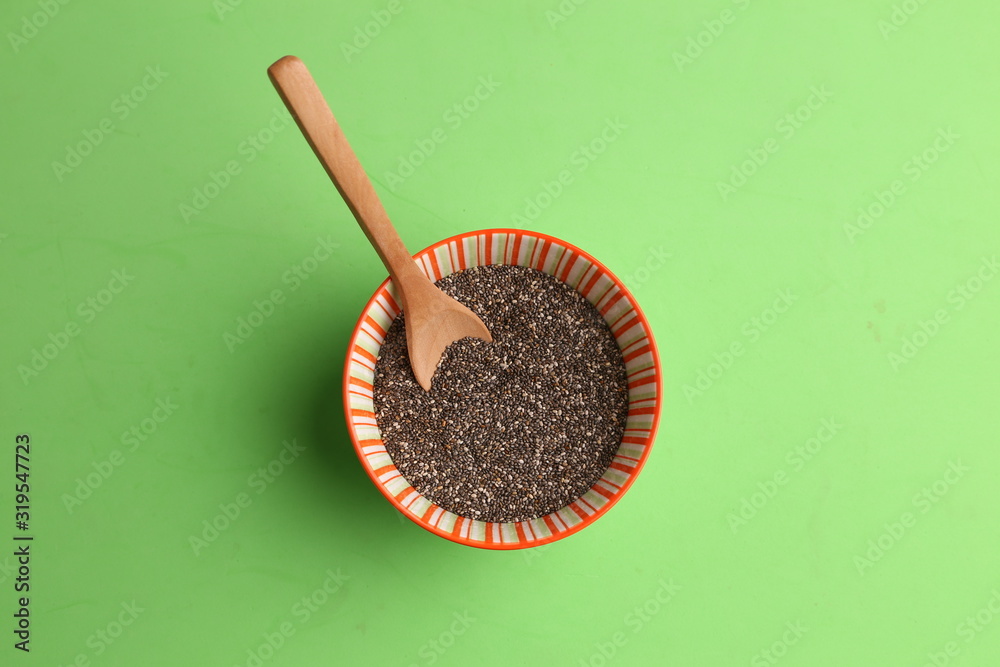 Bowl with chia seeds and wooden spoon