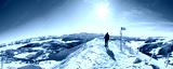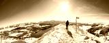 snow shoe hiker a the summit of the snowy mountain. panoramic picture of winter hiker at the top of the hill. gorgeous swiss alps mountain panorama with sun and blue sky