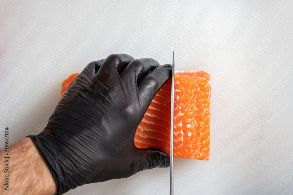 Salmon fillet on a white Board is cut with a knife by a man in black gloves. Top view, flat lay.