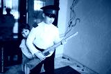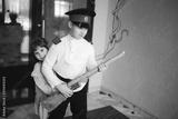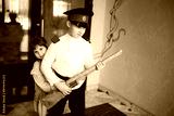 Boy in cadet retro uniform and cap with wooden gun