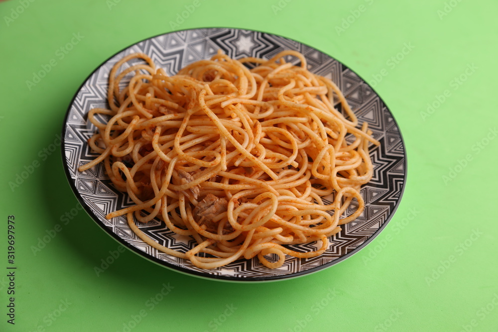 plate of spaghetti pasta with tomato