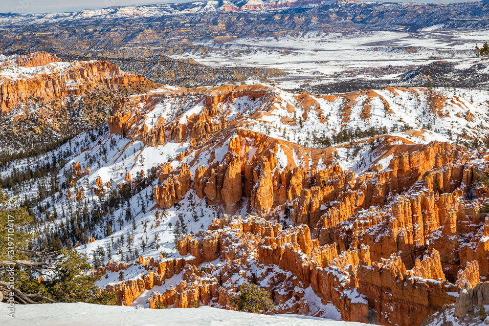 View of Bryce Canyon mountains during winter covered with snow seen from Inspiration Point