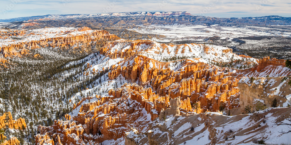 Panoramic view of Bryce Canyon National Park in winter covered with snow seen from Inspiration Point