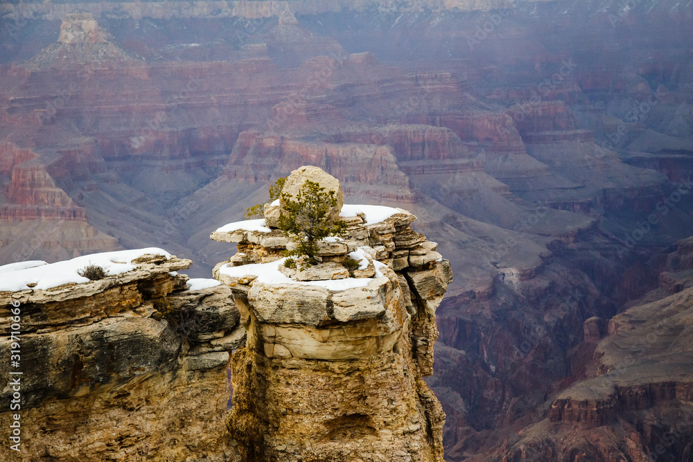 Grand Canyon National Park south rim covered with snow on a winter day in Arizona, USA