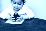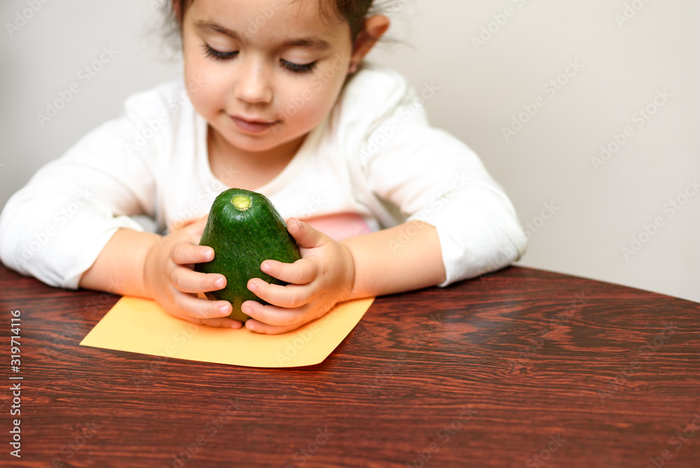 Little cute smiling black hair girl holding green avocado. Healthy food for children concept. Selective focus on avokado.