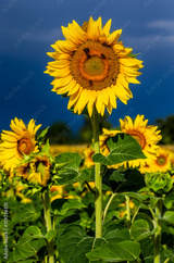 Sunflower close-up on a background of bright blue sky with bees. France. Provence. Valensole
