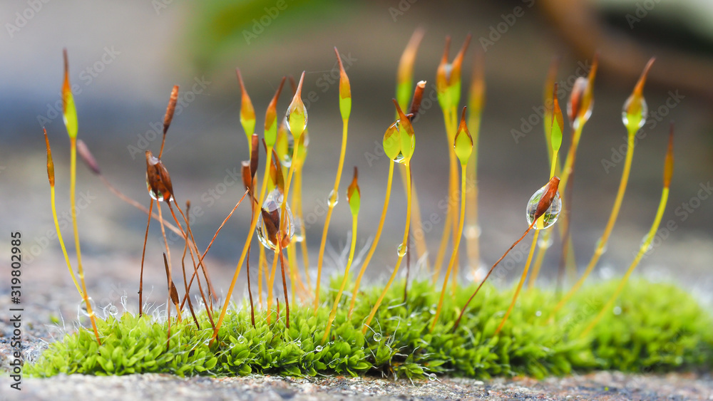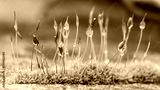Extreme closeup of moss flowers with selective focusing.