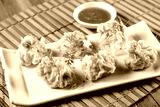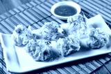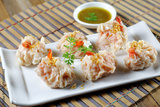 steamed shrimp wontons on white plate with sauce