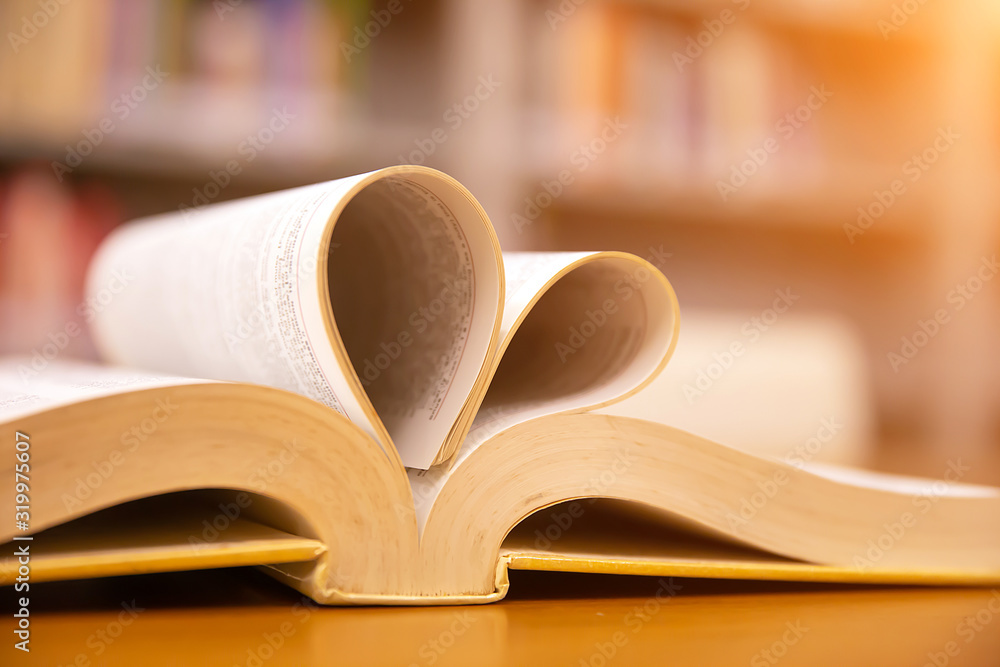 Close up book image in heart shape on the table at library room of lifestyle love to read and february valentine day concepts.