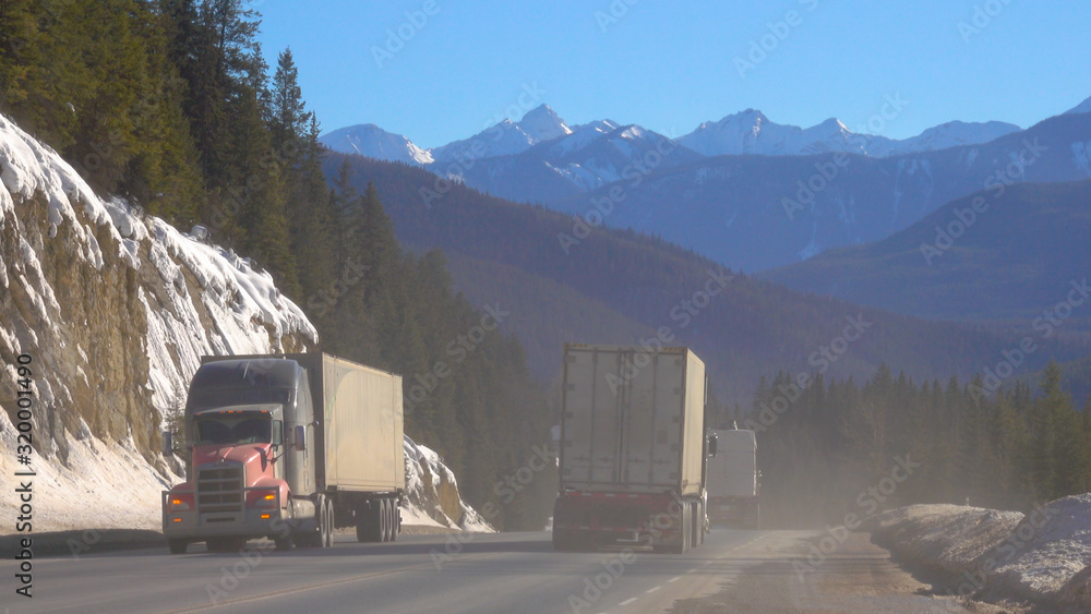 Freight trucks transport containers across the picturesque Banff National Park.