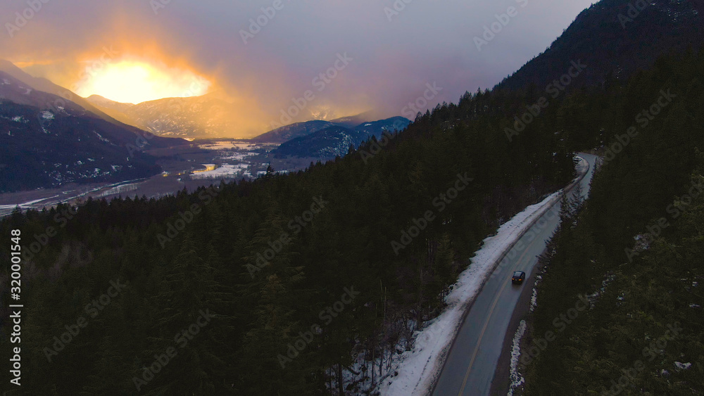 DRONE: Tourists on fun road trip drive up the Sea to Sky Highway at sunrise