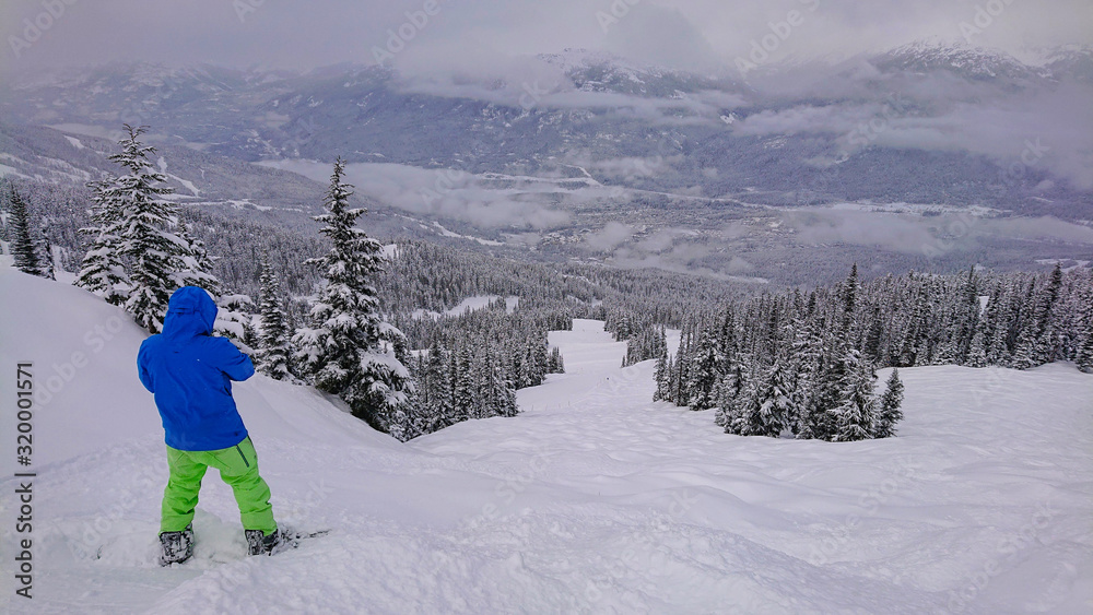 COPY SPACE: Snowboarder takes photos of landscape before riding down mountain.
