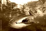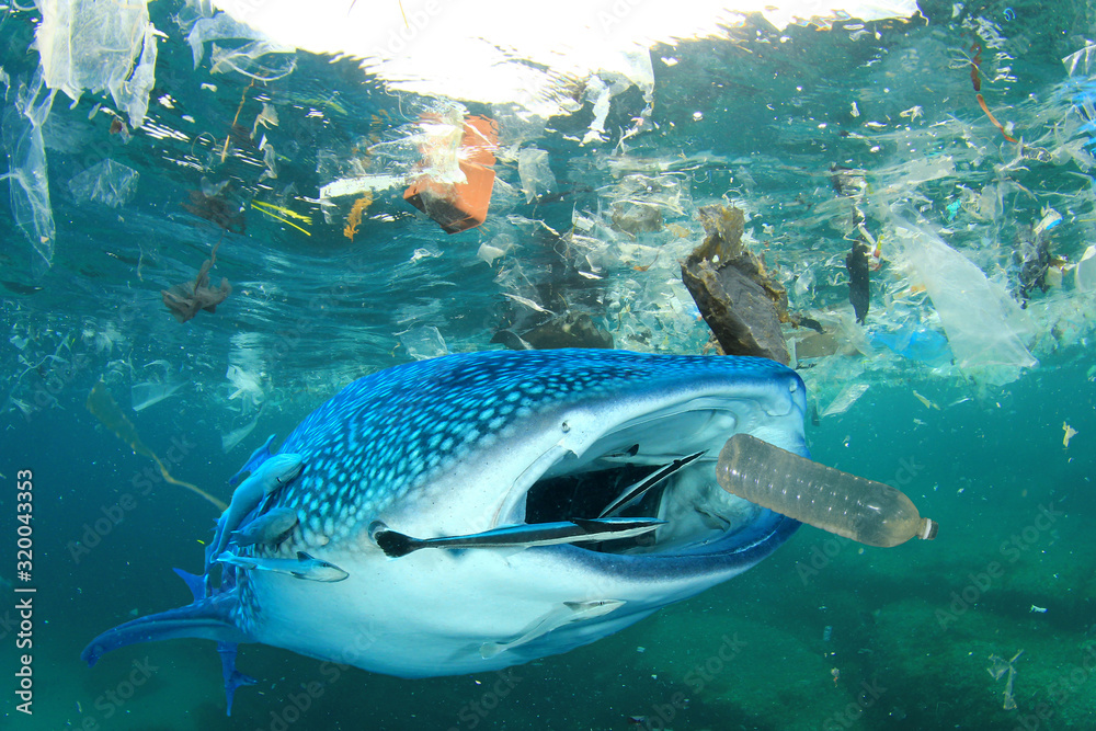 Plastic ocean pollution. Whale Shark filter feeds in polluted ocean, ingesting plastic