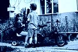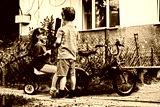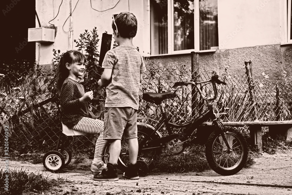 Little kids talk cute about important things. Kids on bikes in retro style