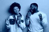 Horizontal shot of amused cheerful woman and man with dark skin have fun during coffee break, sing song along, dance carefree, wear casual pastel clothes, poses over pink wall. Happy emotions