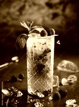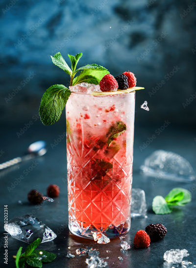 Fresh berries cocktail with raspberry, blackberry, mint and ice in jar glass on dark blue background. Studio shot of drink in freeze motion, flying ice. Summer cold drink and cocktail