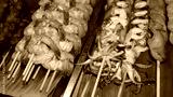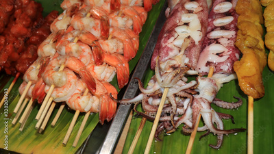 Asian street food: shrimps and calamari barbeque on kebab sticks
