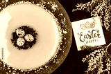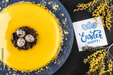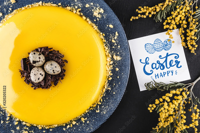 Easter cake with yellow mirror glaze, chocolate, spring flowers, quail eggs on dark stone background. Happy Easter card. Top view, flat lay