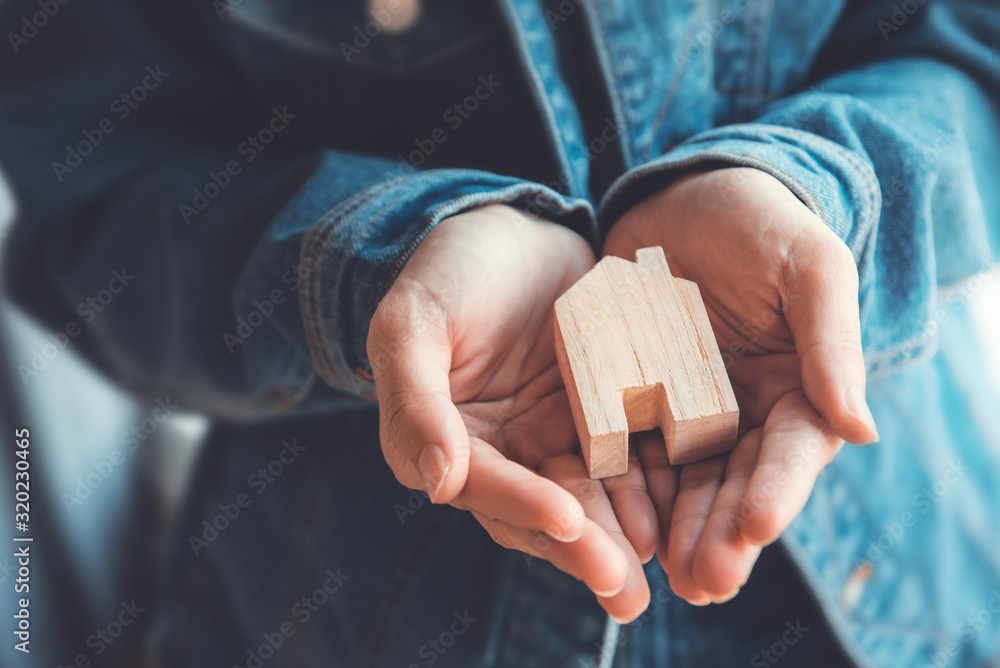 New home and real estate property concept, Woman holding wooden model house in hands.
