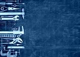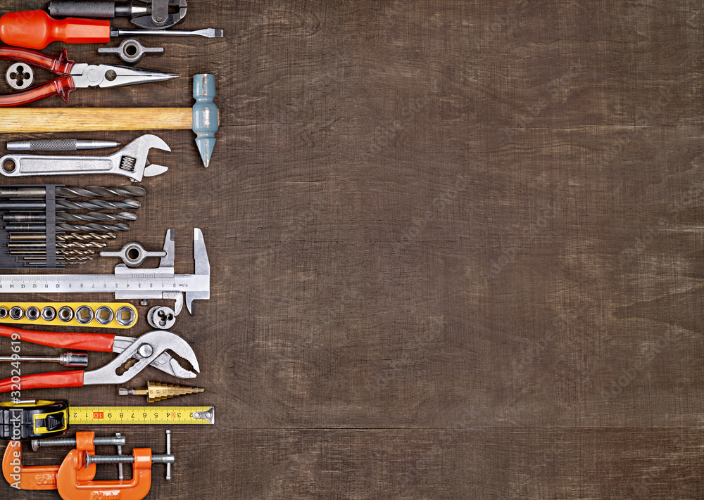 Tools in workshop. On table are tools for various types of construction and repair work on wood, metal, concrete, plastic and other materials.