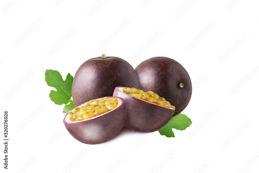 Isolated passion fruit. Two fruit passionfruit with half and green leaves isolated on white background