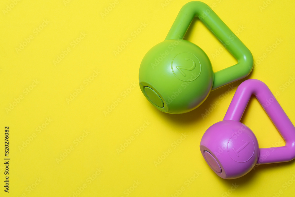 close up of kettlebell or sport equipment on a yellow background, sport and healthy concept