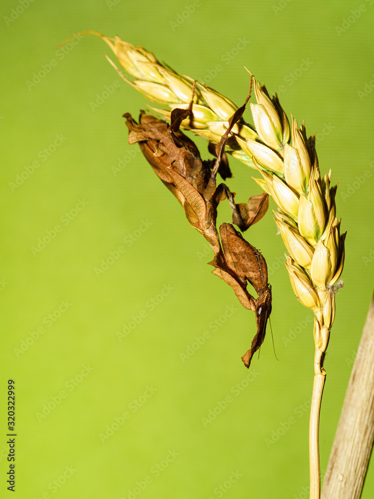 ghost mantis (Phyllocrania paradoxa) on a head of wheat against a bright green background