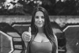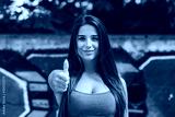 trendy beautiful long haired model posing on graffiti background and show thumb up
