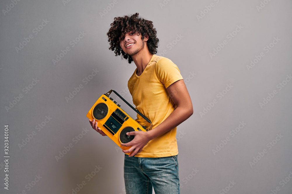 Young handsome eastern man with exotic curly hairstyle holding retro beatbox