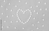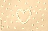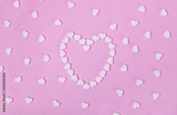 White pills in the shape of a heart scattered on a pink pastel background. Medecine and placebo concept