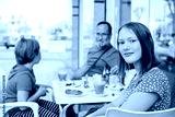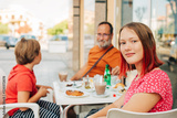 Family with kids having breakfast in outdoor cafe or restaurant, drinking hot chocolate, eating bakeries