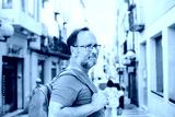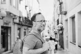 Outdoor portrait of 50 year old man wearing backpack and eyeglasses