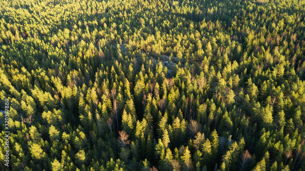 Healthy green trees in a forest of old spruce, fir trees in wilderness of a national park. Ecosystem and healthy environment concepts.View from above.