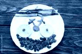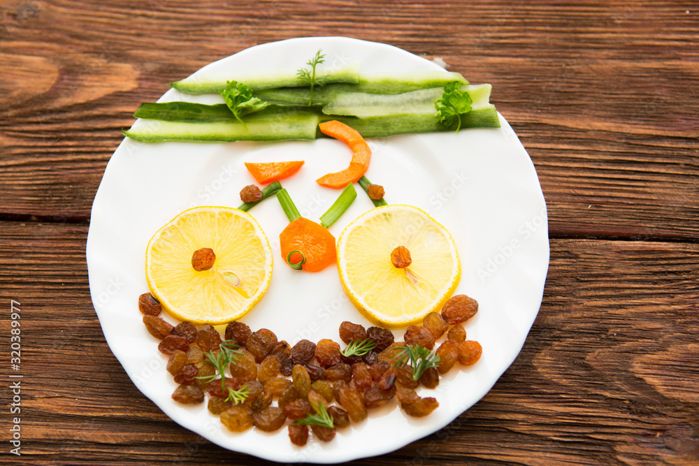 Fresh organic vegetables and fruits on dish over rustic background, top view, place for text. Healthy lifestyle concept - vegetable bike on dish on wooden.