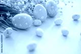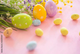 Easter eggs and blooming branches of flowers on a pink wooden background.