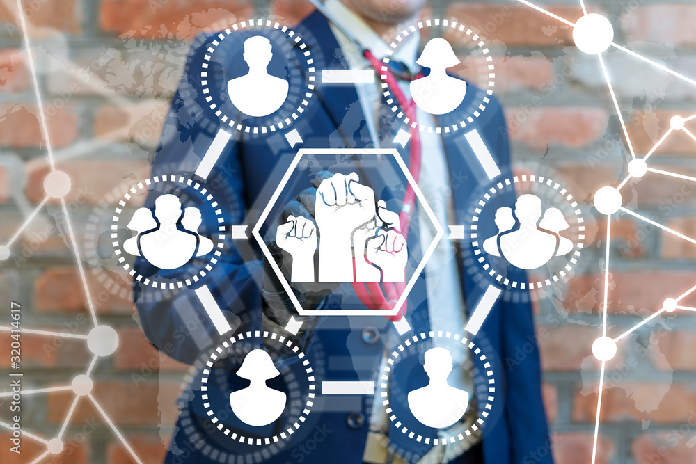 Fist Up Protest Revolution Politics Concept. Politician uses stethoscope touches to fists up icon on virtual interface.