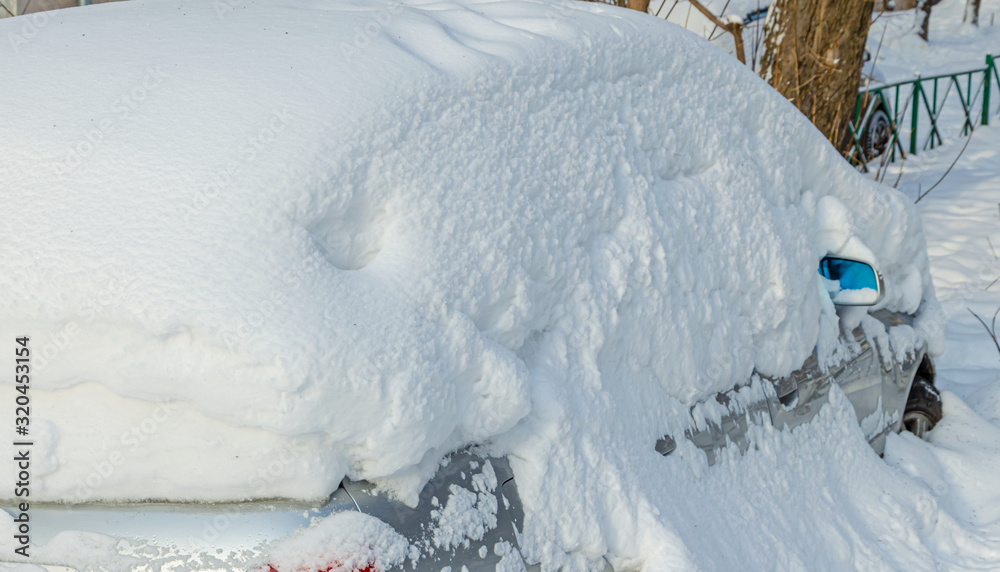 Car under snow on a winter day.