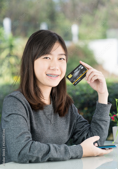 Young woman sitting showing credit card