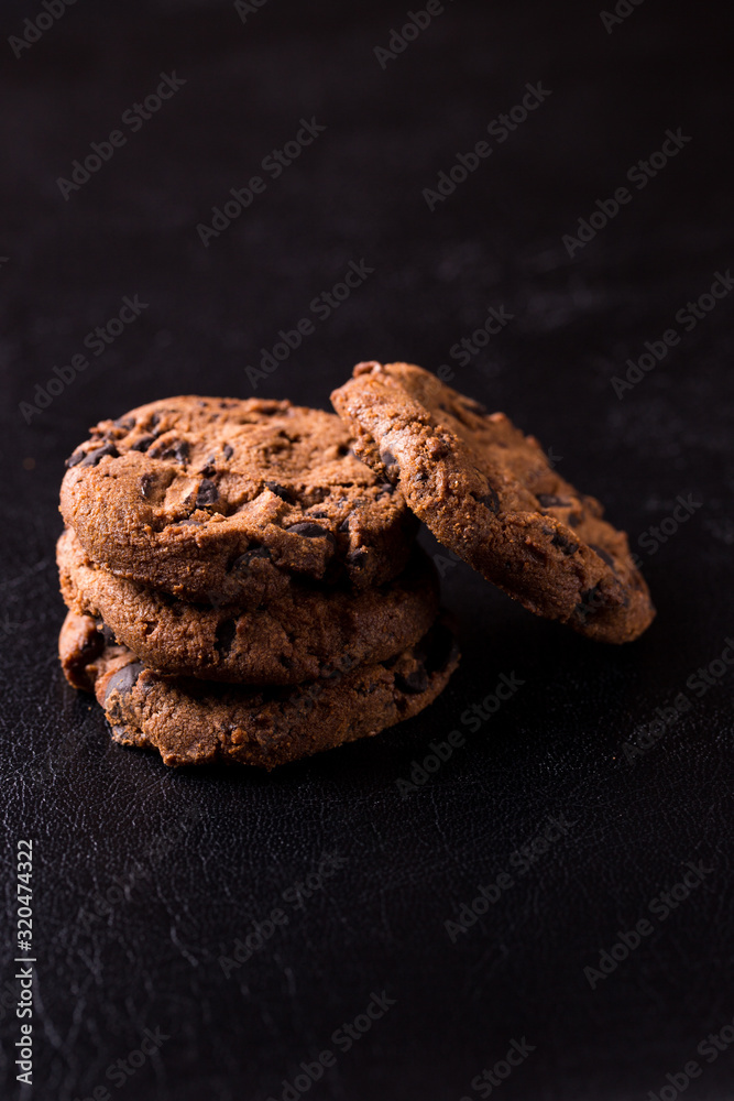 Appetizing chocolate chip cookies with slices of raisins on a black background.