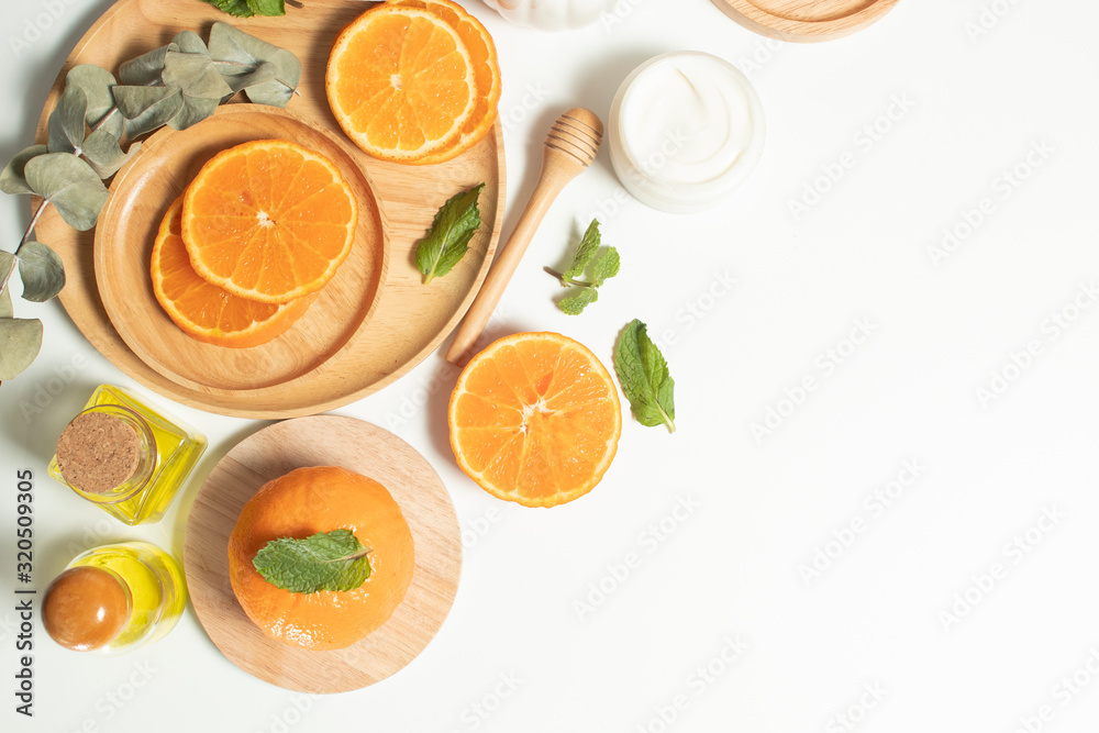 beauty treatment medical skincare and cosmetic lotion cream serum oil mockup bottle packaging product on white decor background with orange fruit citrus diet