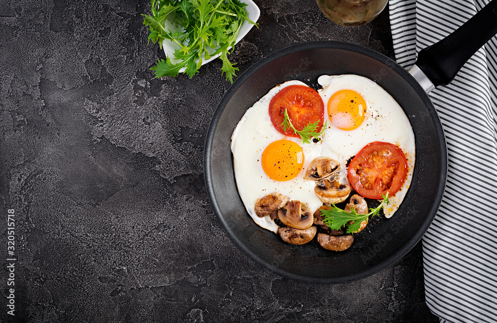 Ketogenic food. Fried egg, mushrooms and sliced tomatoes. Keto, paleo breakfast. Top view, overhead, copy space