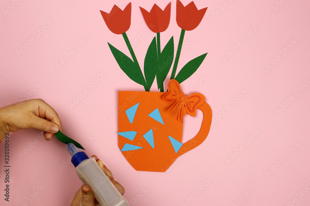 A child makes a Postcard, paper tulips, flowers in a Cup