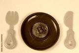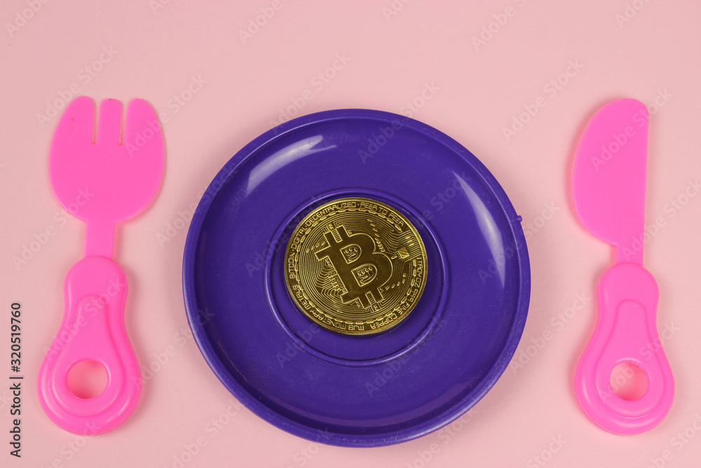 A metal bitcoin coin lies in a plastic plate