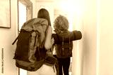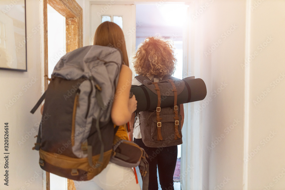 Young women with backpacks arriving to a youth hostel